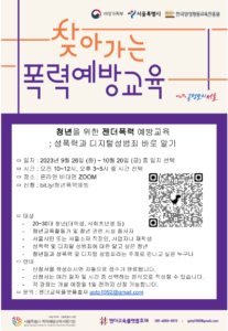 [모집] 청년을 위한 젠더폭력 예방교육_9월 26일부터 10월 26일 중 선택 가능